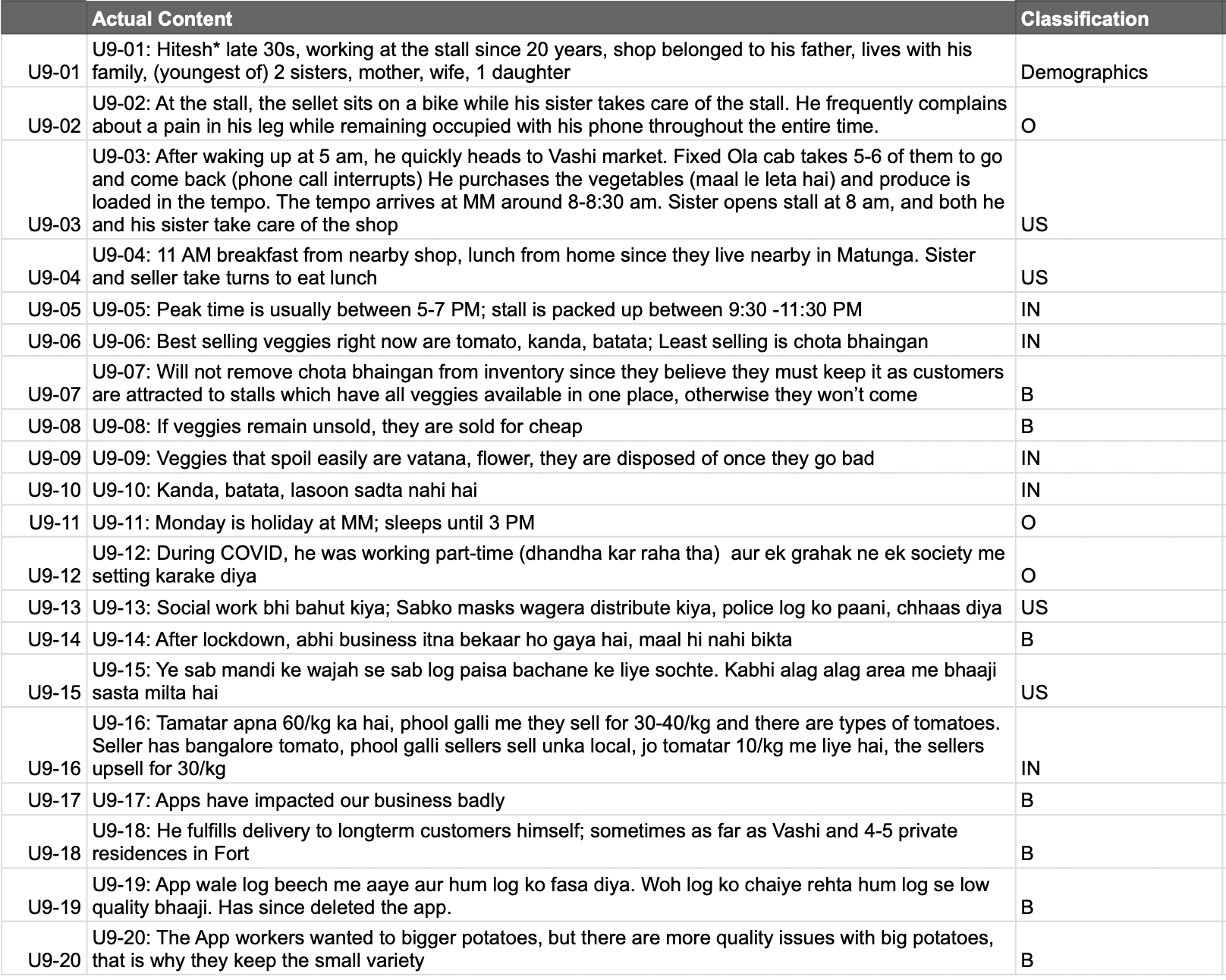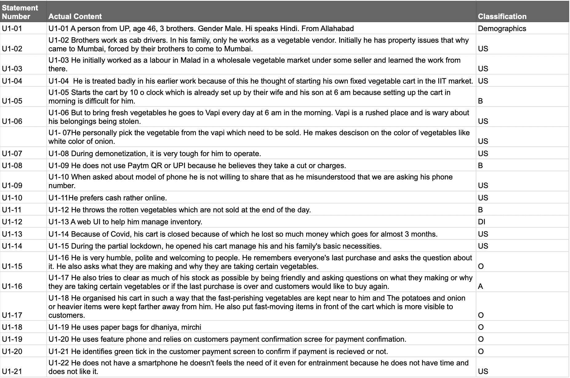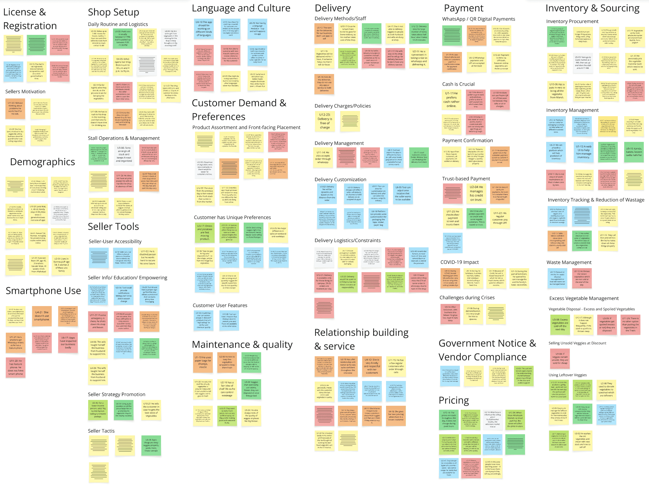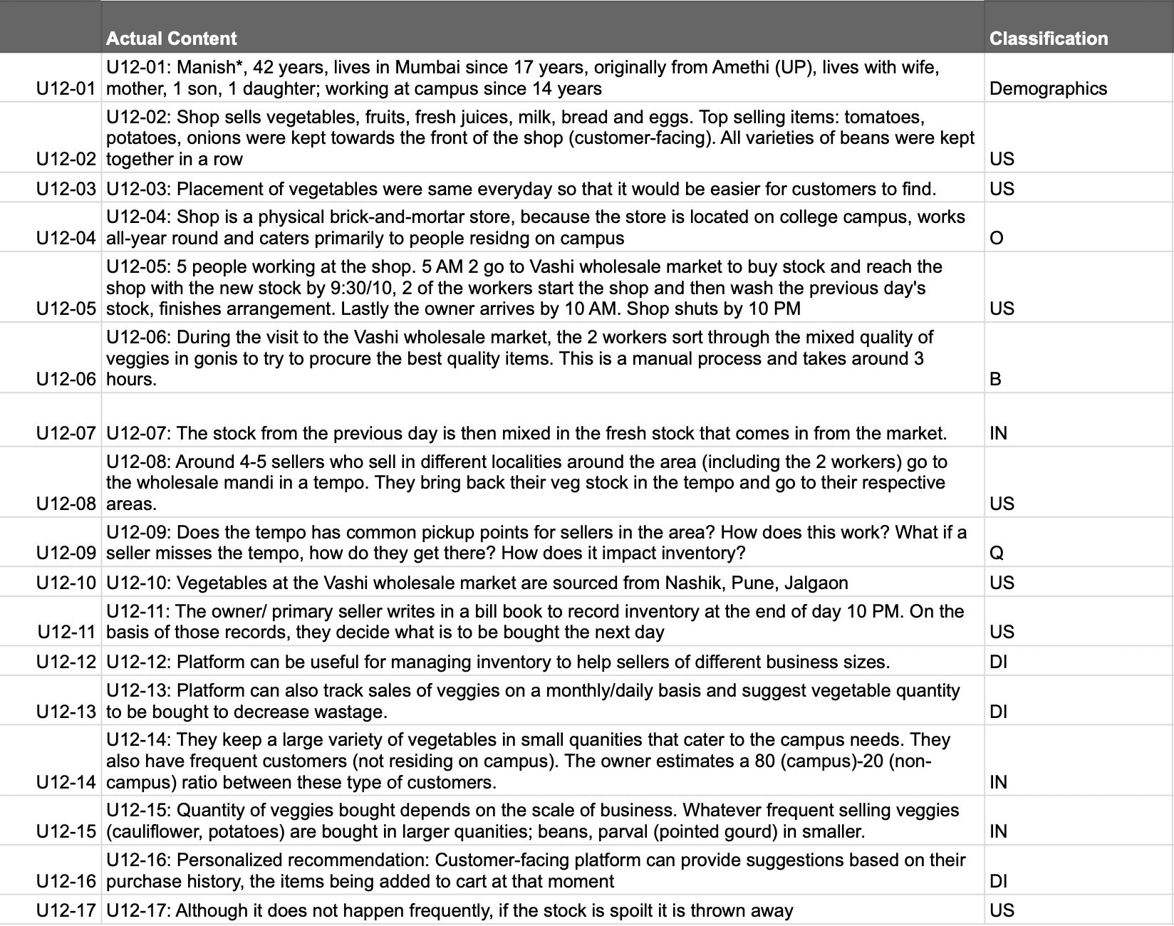 To gain insight from our findings, we documented all the notes from our interviews and categorized them (some samples below)